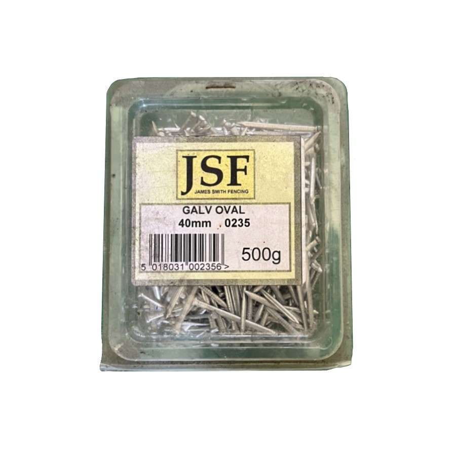 Oval nails are used where concealment is required or where there is a chance that using standard galvanised nails with larger heads would split the timber. The galvanisation helps to stop the nails rusting over time. These nails come in a length of 40mm and in a ½kg tub.
