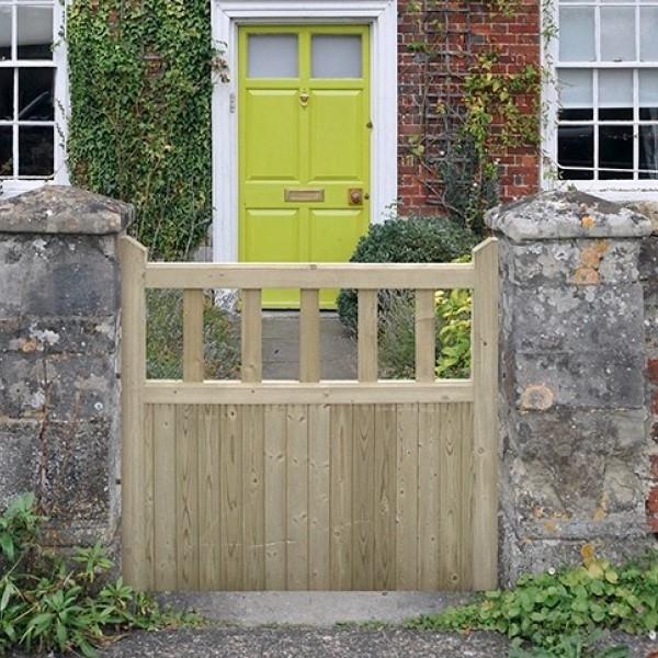 The Charltons Hampton Gate TSW, crafted by Charltons in the United Kingdom, is a classic garden gate distinguished by its tongue and groove match boarding with vertical pales. Constructed with framed, ledged, and braced mortice & tenon joints, it features chamfering on the top and mid-rails, offering an enhanced aesthetic appeal. Designed from quality softwood and pressure-treated for durability, this gate stands at 1.067m (3’6”). It is a versatile option, suitable to be hung from either side, making it an excellent choice for pairing gates. The Charltons Hampton Gate combines traditional design with robust construction, ensuring it stands the test of time in any garden setting.