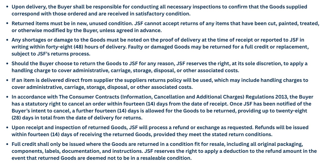 You then have a further 14 days from the date of notifying JSF that you would like to cancel your order to return the goods. You therefore have up to 28 days after delivery to return your goods.