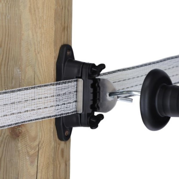 This combi premium insulator enables the simple creation of T-separations on the post. The conductor material can continue to run behind the stainless steel plate and does not have to be interrupted. It gives excellent electrical contact between the conductor material and a gate handle, and can also be used as a corner insulator with a gate. It is universally applicable for tape, rope and wire and the conductor material can be retensioned very easily. This insulator can be nailed on or screwed on and it comes with 2 insulators and 2 stainless steel connecting plates.