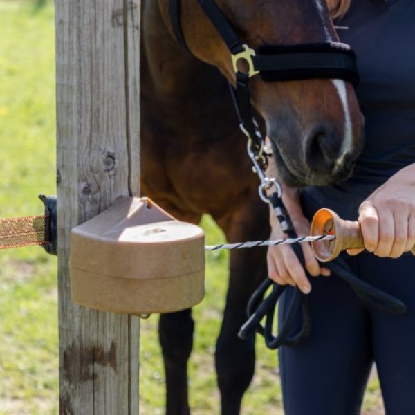 This premium gate set is made from sustainable bio-based plastic with a wood look thanks to small natural wood chips in the bio-plastic. It has an integrated retraction brake ensuring controlled retraction of the conductor material preventing injuries and damage. Situated in a robust housing with, a compact and modern design, this gate set is easy to mount by way of two included wood scews. It is extendable up to 6m and can be mounted on both sides (left or right) of a gateway. Comes with a joining cable to connect to the rope or tape electric fence.